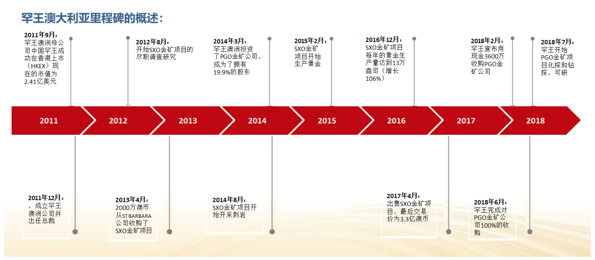 公司具有成功在澳洲勘探、可研、审批、建设、生产运营的管理经验:在2013年成功收购SXO金矿项目并恢复运营,使SXO金矿项目每年的黄金生产量在2016年达到13万盎司(增长106%),并于2017年以3.3亿澳币的交易价成功出售该项目,投资收益(税后净利润)人民币7.63亿。