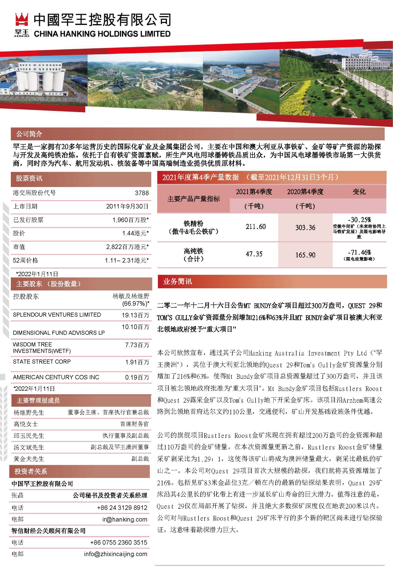 2021年度第4季产量数据 (截至2021年12月31日3个月)