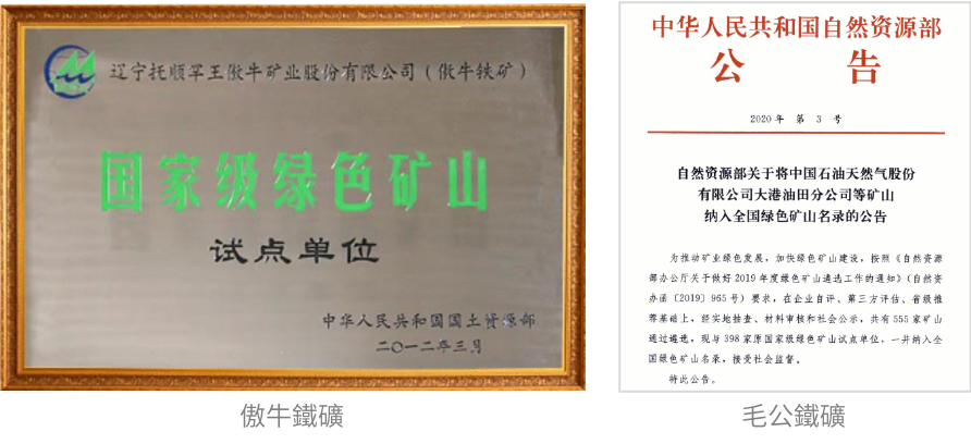 傲牛鐵礦和毛公鐵礦先後榮獲「國家級綠色礦山」稱號。